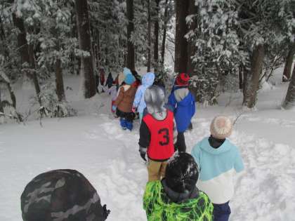 冬の森たんけんの様子です。新雪が積もったハートントンの森を奥へ奥へと進んでいきました。