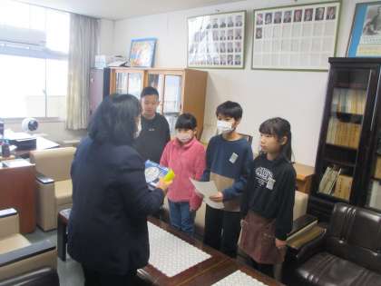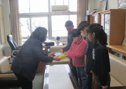 書き損じはがきの贈呈式がありました。学校を代表して5年生の児童が、富山ユネスコ協会の方へ贈呈しました。はがきは、富山ユネスコ協会を通じて日本ユネスコ協会に送られ、換金された後、「世界寺子屋運動」の活動に使われます。
