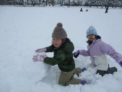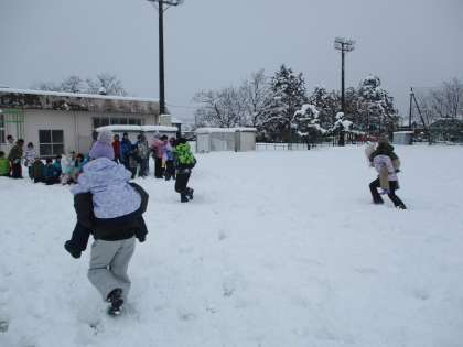 たくさん雪が積もったグラウンドで、6年生と雪遊びをしました。一緒にリレーをしたり、雪だるまを作ったりして遊びました。