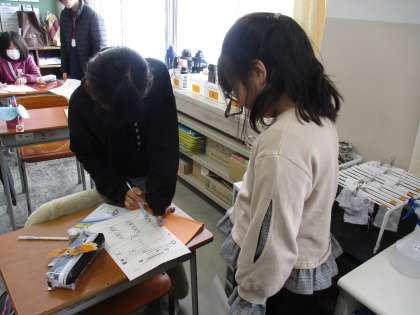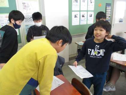 「My favorite place is 〜」と、自分のお気に入りの場所を友達に伝えました。ゲームをしながら様々な英単表現に親しんでいます。