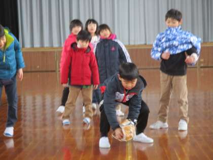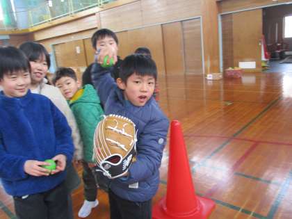 体育館で、グローブをはめてストラックアウトをしたり、ゴロを捕球して返球したりしました。楽しそうに投げる子供たちの姿がたくさん見られました。