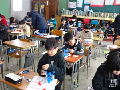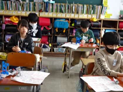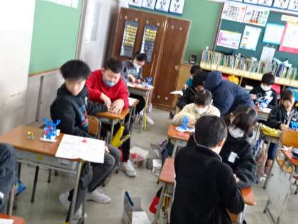 写真は1組の様子です。釘がくっつくことで、電磁石は電流を流すと磁石になることが分かりました。
