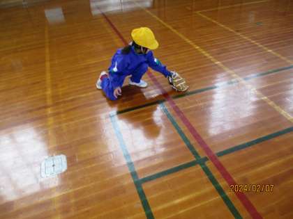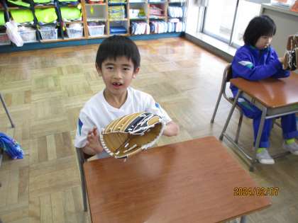 大谷選手寄贈グローブの順番が回ってきました。グローブをはめてボールを投げたり、転がってきたボールを捕球したりしました。大興奮の子供たちでした。