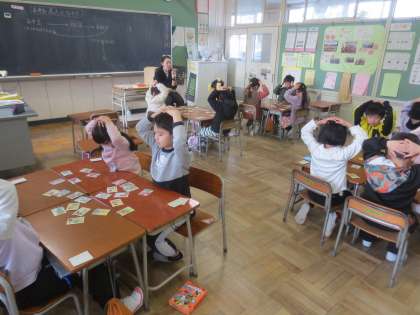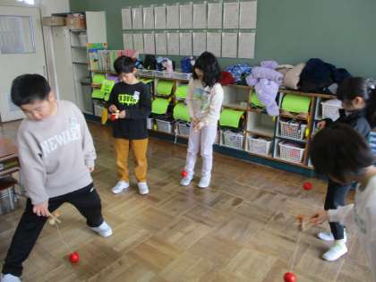 生活科の学習で「昔あそび」をしました。カルタやけん玉、おはじき、お手玉、こまを使って遊びました。