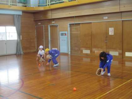 大谷選手寄贈のグローブを使ってキャッチボールをしました。ボールを転がし、グローブでキャッチをしました。