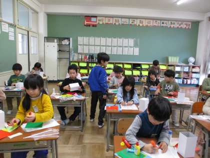 ビニール袋にどのような飾りをつけようか考えていました。完成すると友達同士で見せ合う姿が見られました。