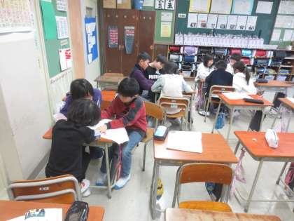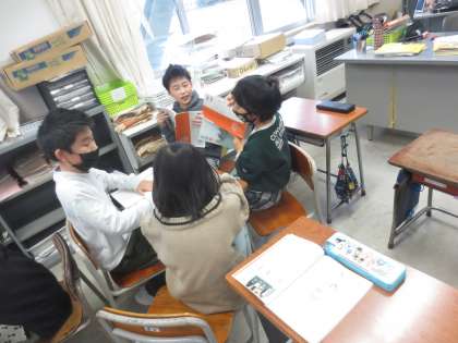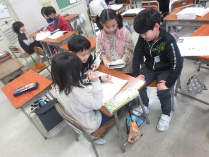 国語科「わたしたちの学校のじまん」の学習で、以前、クロムブックを片手に熊野小学校の自慢を探しました。今日は、その時に撮った写真を参考にして、グループで自慢したいことを1つ決め、自慢したい理由などを話し合いました。活発な話合いが見られました。