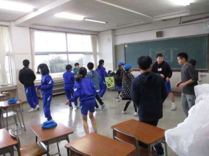 写真は青団と黄団の活動の様子です。自分たちで立ち位置を考えたり、台詞の練習をしたりしました。