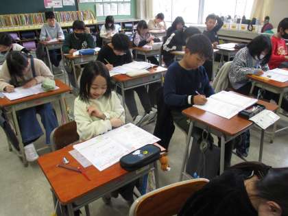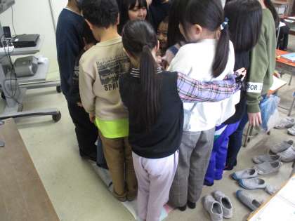 算数科では、面積の学習を進めています。1辺が1メートルの正方形(1平方メートル)の中に何人入れるかを試してみました。どのくらいの広さなのかを考えながら、面積を求める練習をしています。