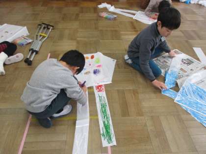 たこに絵を描いている様子です。みんなで凧揚げをする日が楽しみです。
