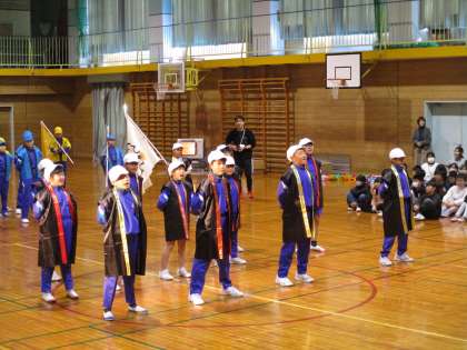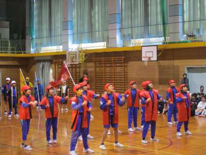 「卒業を祝う会」で5年生は、運動会の時に6年生が創り上げた応援を披露しました。写真は赤団と白団の様子です。