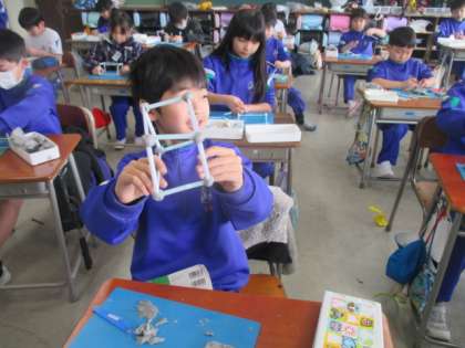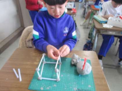 ストローと粘土を使って箱の形を作りました。辺の長さや数、頂点の数等に注目しながら作ることができました。