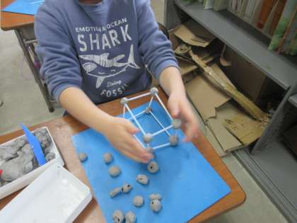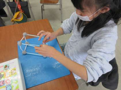 算数科では、はこの形の特徴を調べる学習を行っています。空き箱を写し取ったり、ストローと粘土を組み立てたりしてはこをつくりました。