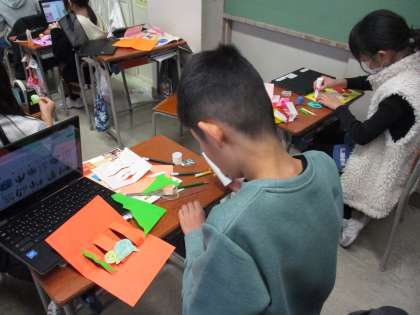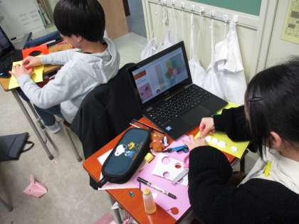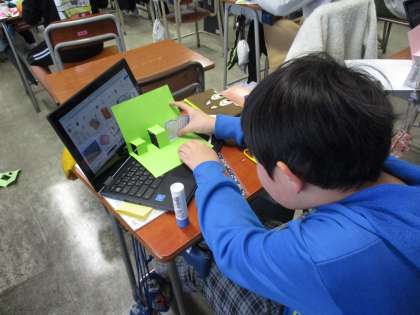 仕掛けカードを作っています。開くと花束や動物等が飛び出すよう、切り込みを入れたり、土台を貼り付けたりして作っています。思いを伝えたい相手のことを考えた温かいカードが完成しそうです。