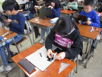 直方体や立方体の特徴について学んでいます。面の数や辺の長さを考えながら展開図を描き、箱を作りました。