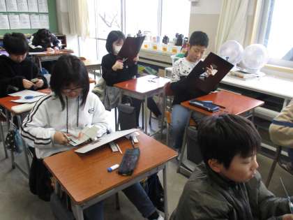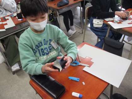 直方体や立方体の特徴について学んでいます。面の数や辺の長さを考えながら展開図を描き、箱を作りました。