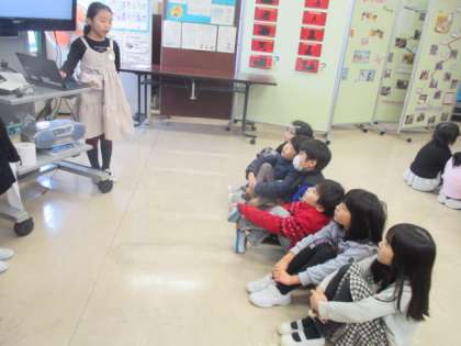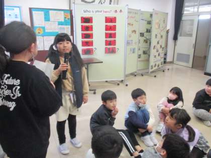 3年生の総合的な学習の時間で学んだことの発表を聞きました。3年生の発表を聞いて、質問をしたり、感想を伝えたりしました。
