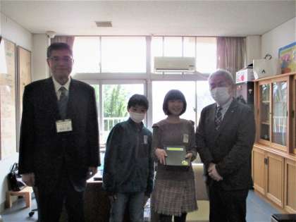 学校を代表して環境委員会の5年生の児童が受け取りました。学校をよりよくするために大切に使わせていただきます。