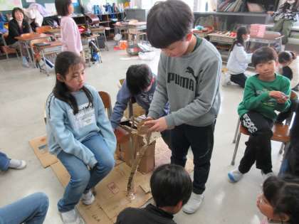 2年2組では、係活動の発表会をしました。3学期は、あそびつくり係、車係、ゴジラ係、おまつり係の4つのグループに分かれて取り組みました。