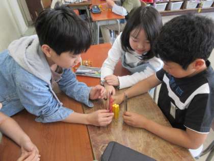 算数科では、直方体や立方体の体積について学習しています。1立方センチメートルのブロックをグループごとに渡し、直方体の形を調べました。