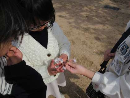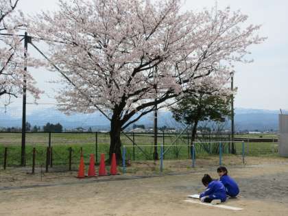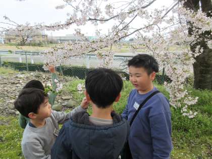 春を探しに校内を回りました。桜を見て「すごく大きいね」と楽しむ子供や、「虫を見つけたよ!」と興味をもってじっとながめる子供の姿がありました。子供たちが、自分の見つけた春を画用紙に描き残しました。一人一人の個性あふれる絵が完成しました。