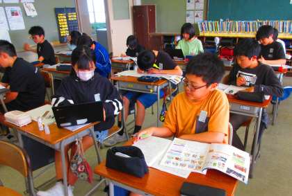 日本国憲法が暮らしにどう関わっているのかを学習しています。今日は基本的人権の尊重について調べました。教科書やクロムブックを使って情報を集めています。写真は2組の様子です。