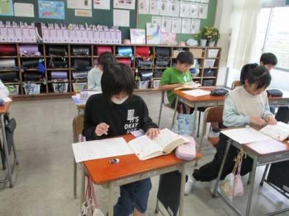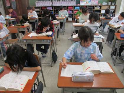 国語科では、漢字辞典の使い方について学習しています。漢字辞典を使うと、漢字の読み方や意味等を調べることができることを知り、いろいろな漢字について調べました。