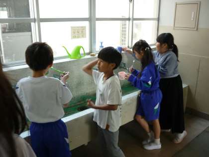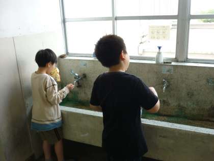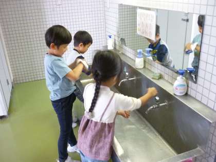 校内を見回っていると、トイレの後に石けんを使って上手に手洗いをしていました。(1年生)歯みがきタイムには、丁寧に歯をみがいていました。(2・3年生)