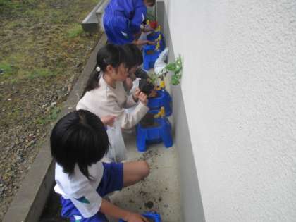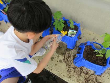 生活科では、野菜を育てる学習が始まりました。今日は、一人一人が選んだ野菜の苗を植えました。「優しく土に植えよう」と愛情をもって育てようとする子供の姿や、「元気に育ってね」と願いをもって活動に取り組む子供たちの姿が見られました。