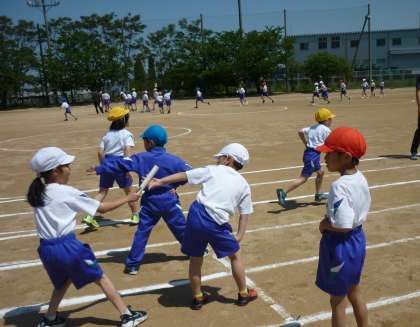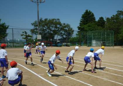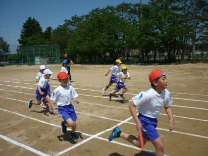 運動会のリレーの練習の様子です。上手にバトンパスができるように、何度も練習しています。