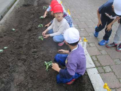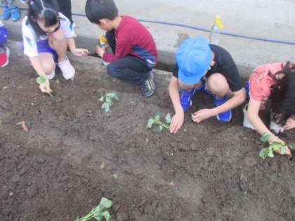 一人一人が育てている野菜に加えて、2年生全員でサツマイモを育てます。今日は、一人一本苗を植えました。トマトやキュウリの苗と違う形であることに気づきながら、「どんな風に育つのかな」「土のお布団かけて育てよう」等、思いをもって活動に取り組んでいました。
