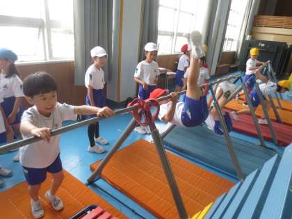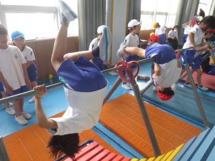 体育で、鉄棒の練習に励んでいます。補助板を使用して逆上がりができた際には、達成感で溢れた嬉しそうな顔が見られました。
