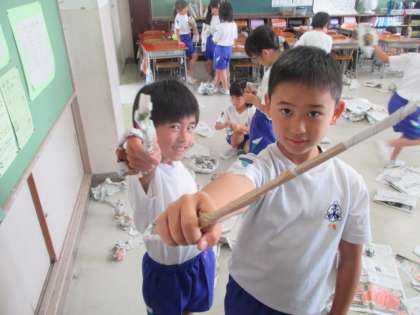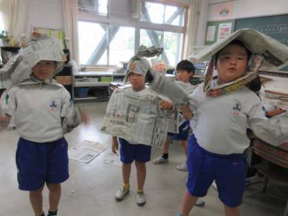 新聞紙ちぎったり丸めたりして楽しく活動しました。マントや帽子を作って様々に仮装をする子、家を作る子、武器を作って互いに自慢し合う子など、いろいろな工夫が見られました。「新聞紙があればなんでも作れるね」と、ワクワクイメージを広げながら取り組む子供たちでした。