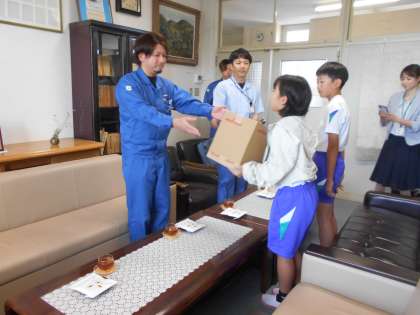 村田製作所様から、使用済みインクカートリッジをいただきました。運営員会の委員長と副委員長が受け取り、挨拶をしました。