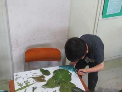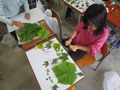 図工の時間に「お気に入りの葉」の学習を行いました。集めた葉を思い思いに並べ、形や色、組み合わせによる感じ、色の明るさなどを味わいました。