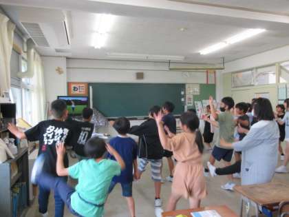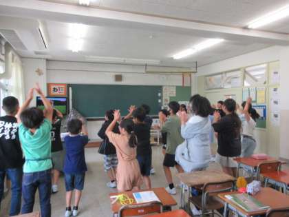 体力つくりタイムでは、健康委員会が選んだダンスをしています。音楽に合わせて楽しそうにダンスをしています。