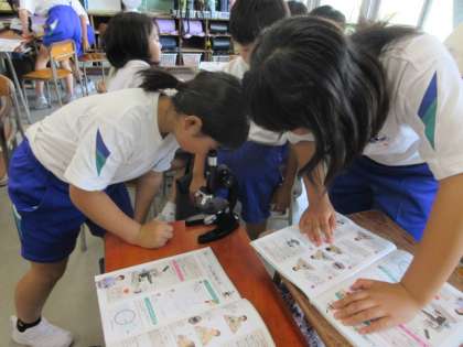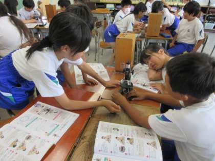 顕微鏡の使い方を学習しています。目には見えづらい物を顕微鏡にセットして使い方を確かめながら使用しました。