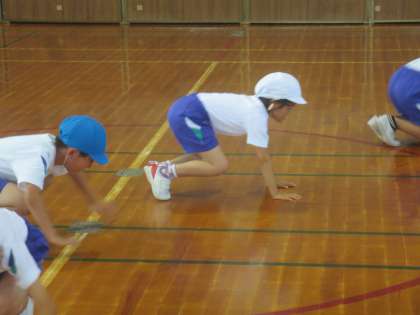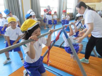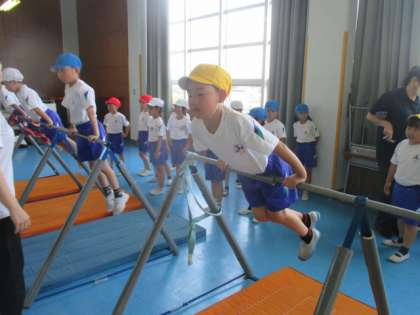 スポーツ指導員の方に来ていただき、マット運動や鉄棒の指導を受けました。鉄棒につながる身体の動きを楽しく覚えたり、実際に動いてみたりと、充実した1時間になりました。