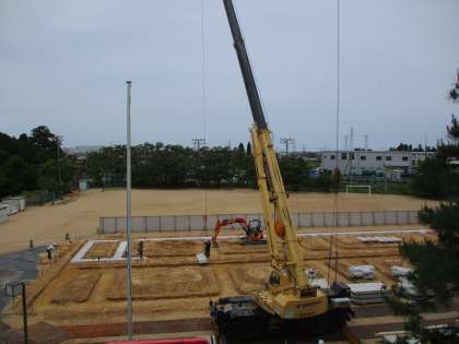 グラウンドには、クレーン車やトラックなど、工事用車両が出入りをしています。