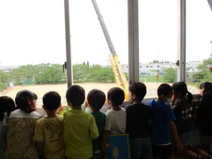 「すごい!」「工事の人たち、頑張って!」と、子供たちは工事用車両や工事をしてくださる方々に興味津々な様子です。