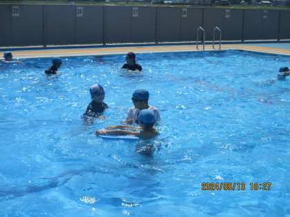 水泳学習が始まっています。お天気にも恵まれ、子供たちは水に親しみ、浮いたり、けのびをしたり、バタ足の練習に取り組んだりしています。