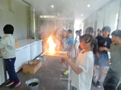 埋蔵文化財センターでは、石器時代から近代までの文化遺産を見学した後、火おこし体験を行いました。