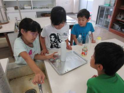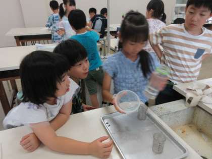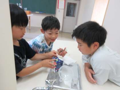 算数科で水のかさの学習をしています。グループで協力して、家庭から持参した容器の水のかさを測り、学習した単位の「デシリットル(dL)」を使って表しました。学習したことを、実際に測ってみて経験することで、単位の必要性改めてを感じることができる時間になりました。これは2組の様子です。