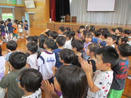 壮行会では、1年生の代表児童が、手をつなぎながら体育館に入場しました。