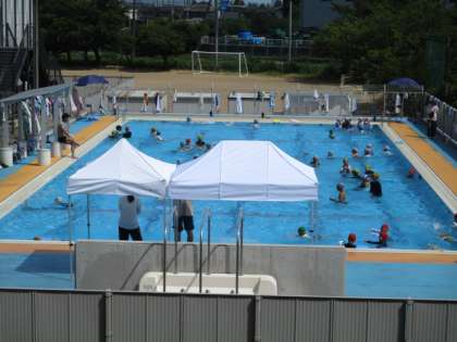 夏休みに入り、プール開放は連日大盛況です。今年は開放時刻を早めたり、有隣育友会からベルマークで購入していただいたテントをプールサイドに立てて日陰をつくったりしながら、熱中症予防に努めて実施しています。