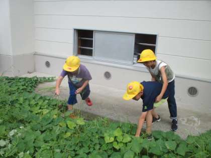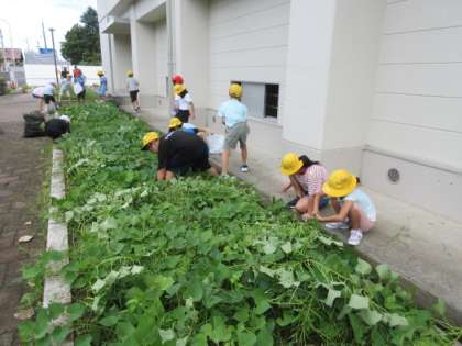 夏休みに大きく生長したサツマイモの、周りに生えた草をむしりました。「1学期よりもツルがのびたね」「サツマイモできているかな」と、様々な思いをもちながら取り組みました。