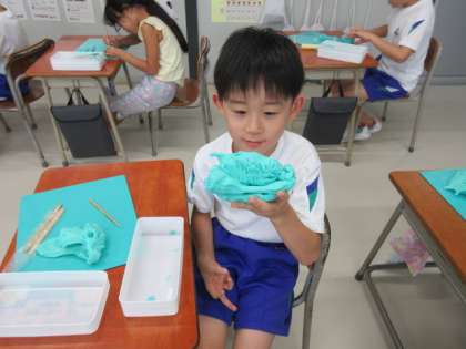 図画工作科の授業で、夏に関係するものや思い出を粘土で表しました。場所や食べ物や生き物など、自分の夏休みを振り返りながら活動する子供たちです。