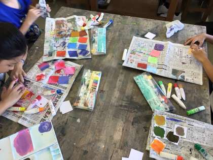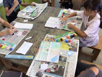 図画工作科では、絵の具を指で混ぜ合わせ様々な色をつくりました。色の混ぜ方や絵の具の量を工夫して思い思いの色をつくっていました。