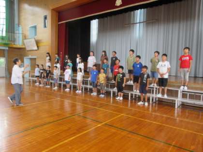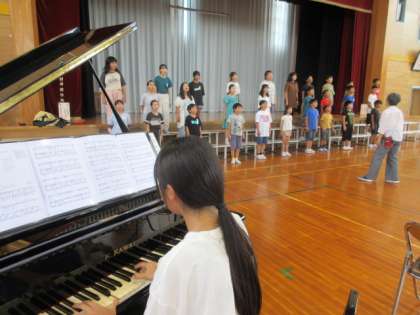 ゲストティーチャーをお招きして区域音楽会に向けての合唱練習をしました。声の出し方や声の響かせ方を指導していただきました。本番まで3週間。学級全体で頑張っていきます。