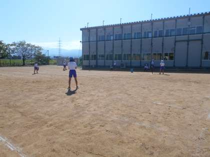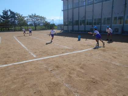 体育科では、ベースボール型ゲームをしています。団の仲間と声を掛け合いながら、試合を楽しんでいます。